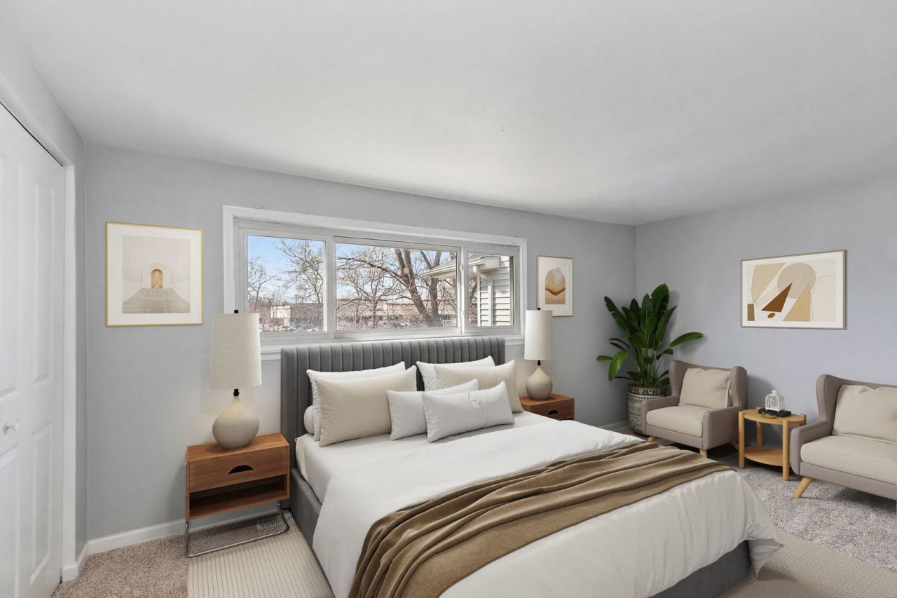 This home features fresh paint and offers two full bedrooms along with a bright, inviting living room highlighted by an accent-clad gas fireplace. The living area flows into the dining space and kitchen, where functional shelving above the server provides added storage. The galley kitchen is equipped with granite countertops, high-end cabinetry, a custom backsplash, and stainless steel appliances, with a sliding glass door leading to a private, fenced patio and storage shed. Upstairs, you will find a full bathroom with an updated vanity, modern light fixture, and a partially tiled shower with a built-in shampoo niche, along with two spacious bedrooms. The full basement expands the living space and includes a partially finished bathroom with jetted tub and vanity sink, recessed lighting, and wood wall paneling. Laundry is conveniently located in the unit, offering added everyday functionality. This unit is in a prime location off of IL-RT. 53, near dining, groceries, shopping, parks, and more!