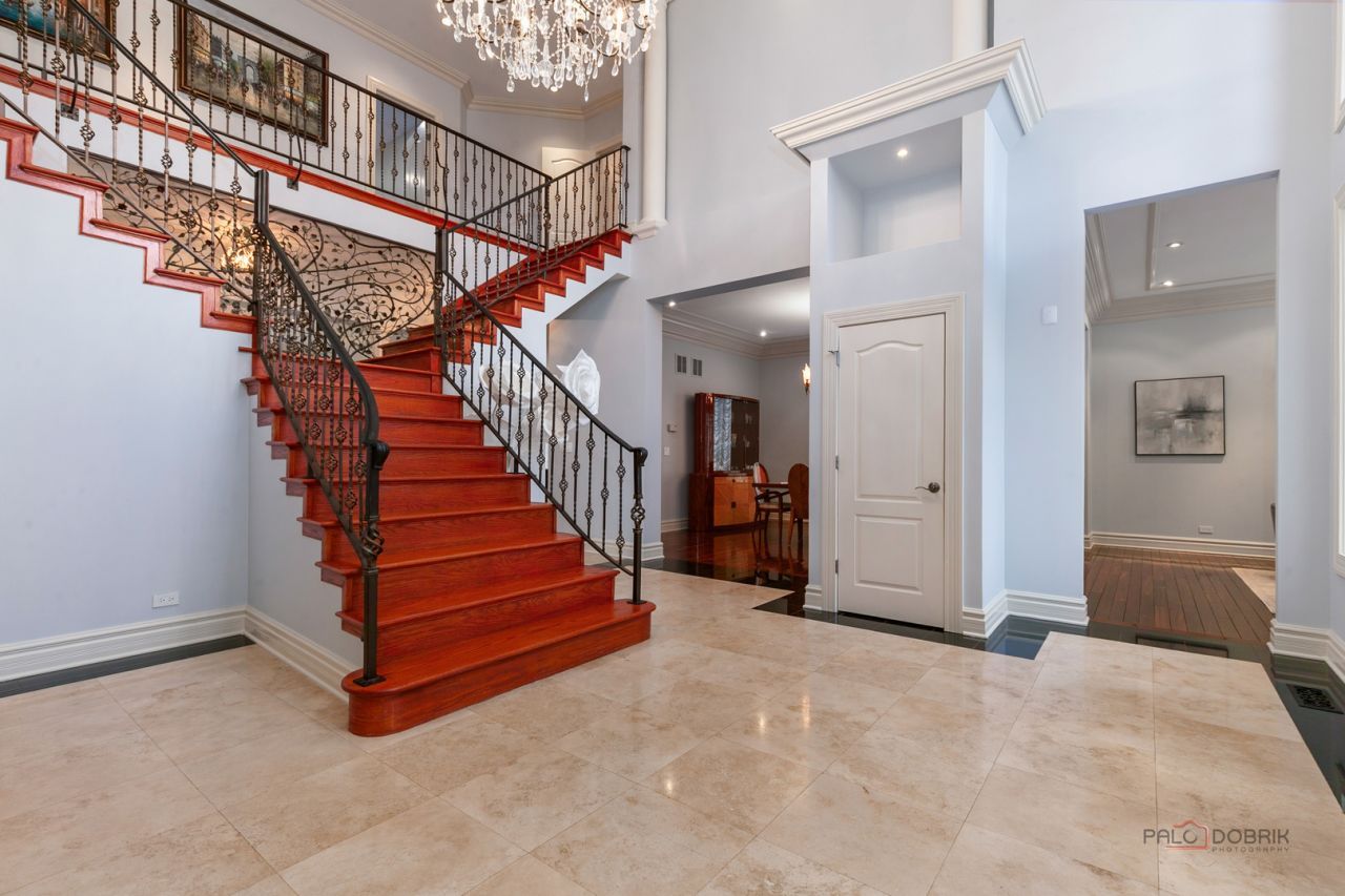Welcome to this exceptional 6+1 bedroom, 6-bathroom corner-lot residence in prestigious Lincolnshire, proudly served by award-winning Adlai E. Stevenson High School and Laura B. Sprague School. A dramatic two-story foyer with a grand chandelier ceiling and elegant wrought-iron staircase creates a breathtaking first impression, complemented by full marble flooring throughout the main level. The thoughtfully designed layout offers both sophistication and comfort. To the right, the expansive great room seamlessly combines the living and dining areas-perfect for everyday living and effortless entertaining. The beautifully appointed kitchen features stainless steel appliances, granite countertops and backsplash, a spacious island with breakfast bar, and abundant cabinetry. The adjoining eating area opens directly to the screened-in porch, creating a seamless indoor-outdoor living experience. The impressive two-story family room showcases a stunning marble fireplace and additional access to the screened porch, framed by elegant white columns that enhance the architectural charm. A main-level bedroom with sliding glass doors to the backyard and a full bath provides flexibility for guests, in-laws, or a private home office. Upstairs, retreat to the luxurious primary suite offering three walk-in closets, a vaulted ceiling, and a spa-inspired ensuite with dual vanities, whirlpool tub, separate shower, and a private balcony with serene views. The second and fifth bedrooms each feature private en-suite baths, while the third and fourth bedrooms share a convenient Jack-and-Jill bathroom. A second-floor laundry room adds everyday convenience. The fully finished basement expands your living space with a seventh bedroom, full bath, and a large recreational area ready for endless possibilities-media room, fitness space, playroom, or more. This remarkable home blends elegance, space, and functionality in one of the area's most desirable communities-an exceptional opportunity to make your dream home a reality.